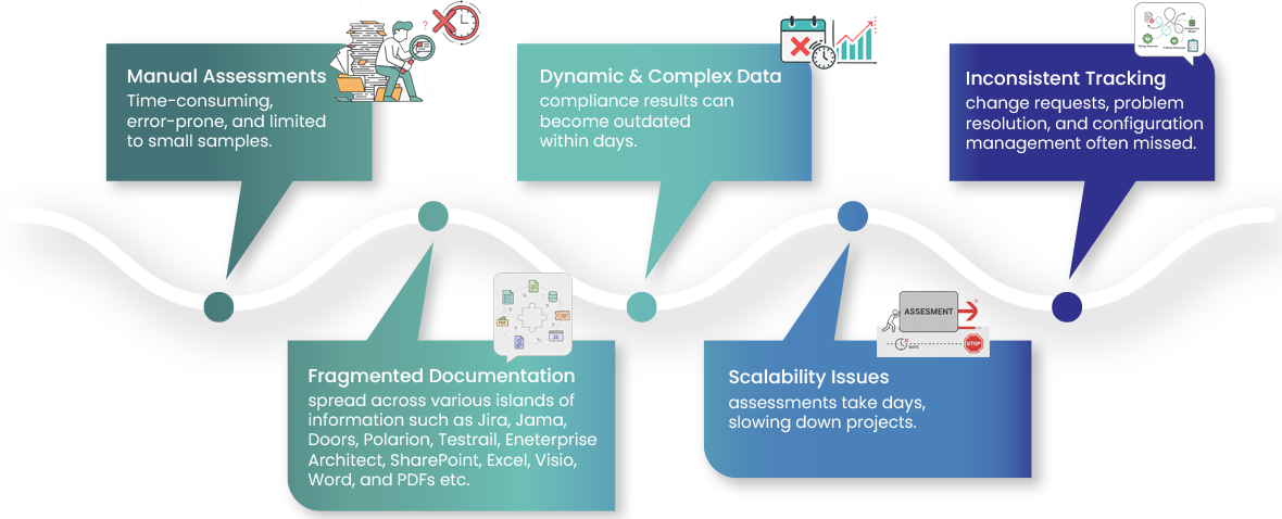 Fragmented Documentation spread across various islands of information such as Jira, Jama, Doors, Polarion, Testrail, Eneterprise Architect, SharePoint, Excel, Visio, Word, and PDFs etc.