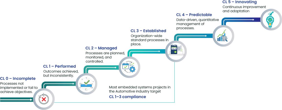 ASPICE defines Capability Levels (CL) that measure how well an organization’s processes are established: