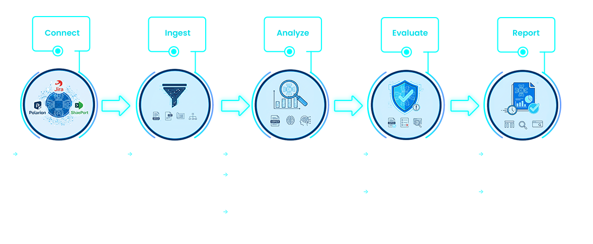 Seamless Toolchain Integration – Connects with your tool chains and other inhouse repositories to evaluate ASPICE compliance.