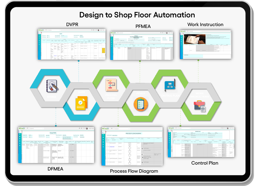 Dynamic links between FMEAs, Process Flows, Control Plans, Check Sheets, and Work Instructions.